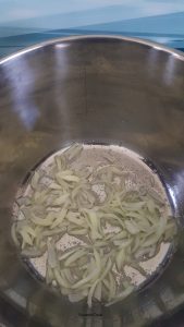1- La préparation du caramel, pour cela j’utilise un oignon : dans un grand faitout bien large, mettre 2/3 cas d’huile de tournesol, placer un gros oignon coupé assez finement et laisser l’oignon se déshydrater en remuant de temps en temps.