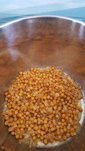 2- Pendant ce temps on prépare les pois chiches, environ 300g : on les rince bien et retire les peaux (faute de temps, j’utilise des pois chiches en bocal). Ensuite on les incorpore avec les oignons et on ajoute les épices : paprika, un peu de cumin, poivre (si vous aimez), sel et 1 cas bombée de sucre en poudre. On mélange le tout et on laisse caraméliser environ 10 min, les pois chiches doivent prendre déjà une belle couleur marron.