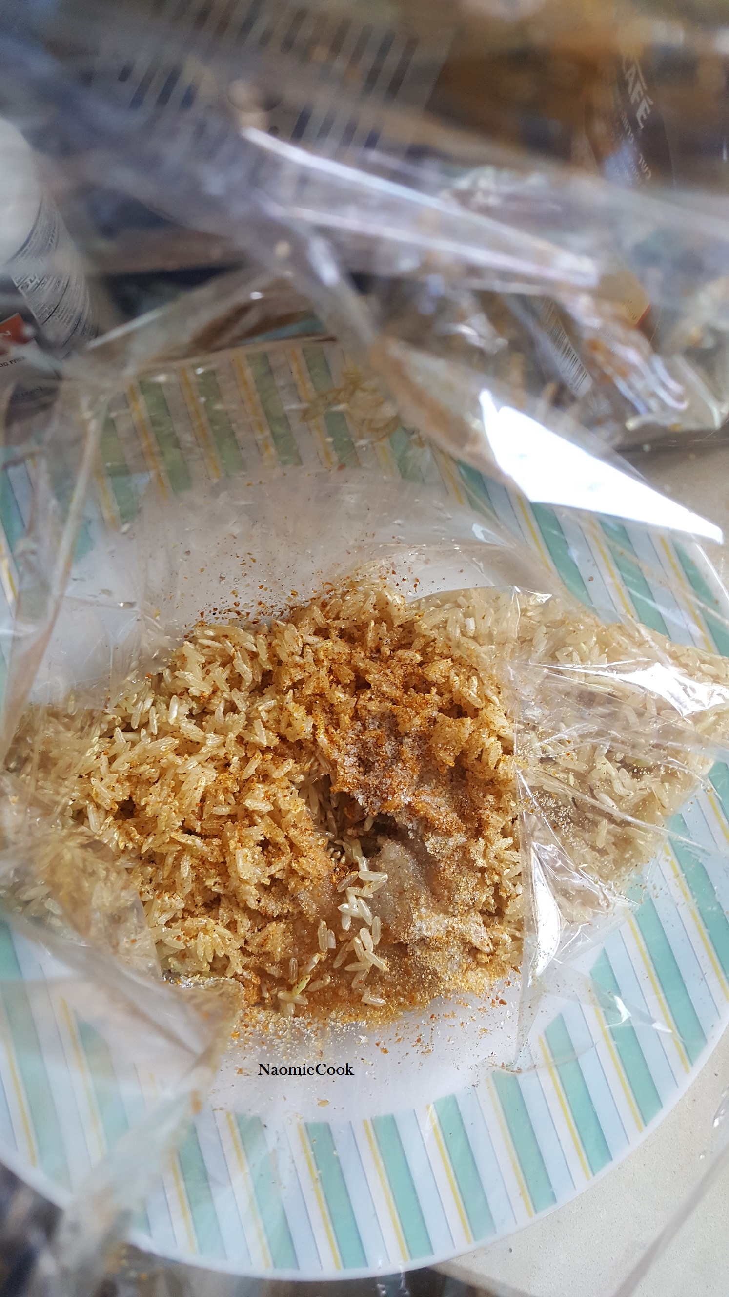 Le riz, choisir du riz complet qui tient mieux à la cuisson plutôt que du riz classic que vous retrouverai vraiment trop cuit au moment de servir. Pour environ 1 verre plein : je le vérifie grin à grin dans une assiette plate (c’est à faire car attention il peut y avoir des vers j’en ai déjà trouvé) puis je rince bien dans une passoire métallique. Je place le riz dans un sac est j’ajoute les épices : curcuma, sel, 1 cas d’huile de tournesol, un petit oignon ou 2 gousses d’ail ou encore de l’ail en poudre (que j’utilise cette fois-ci).
